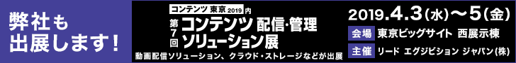 昨年に続き、2019年4月3日(水)~5日(金)開催の「コンテンツ東京内 第7回コンテンツ配信・管理ソリューション展」に出展いたします。